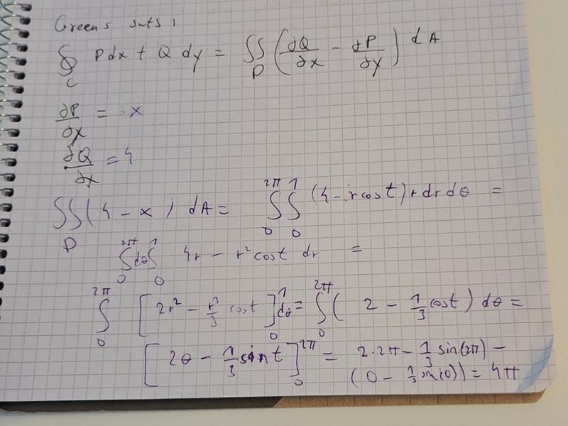 Nej, tanken är bara att använda Greens formel en gång men inte på det sättet som du använde det. Om vi kollar på den senaste bilden som jag infogade och låter F=(P,Q)=(xy+ln(1+x2),4x+ey2+3arctan(y)).Då vill vi använda Greens formel för det inneslutna området (området som begränsas av den blåa och den gröna kurvan, säg att området kallas D). Då får man Pdx+Qdy=Qx-Pydxdy=(4+x)dxdy=4dxdy=4Area(D)=2pi. Då behöver vi beräkna kurvintegralen för den gröna kurvan (från (-1,0) till (1,0)) och sedan subtrahera detta från det tidigare resultatet (2pi).