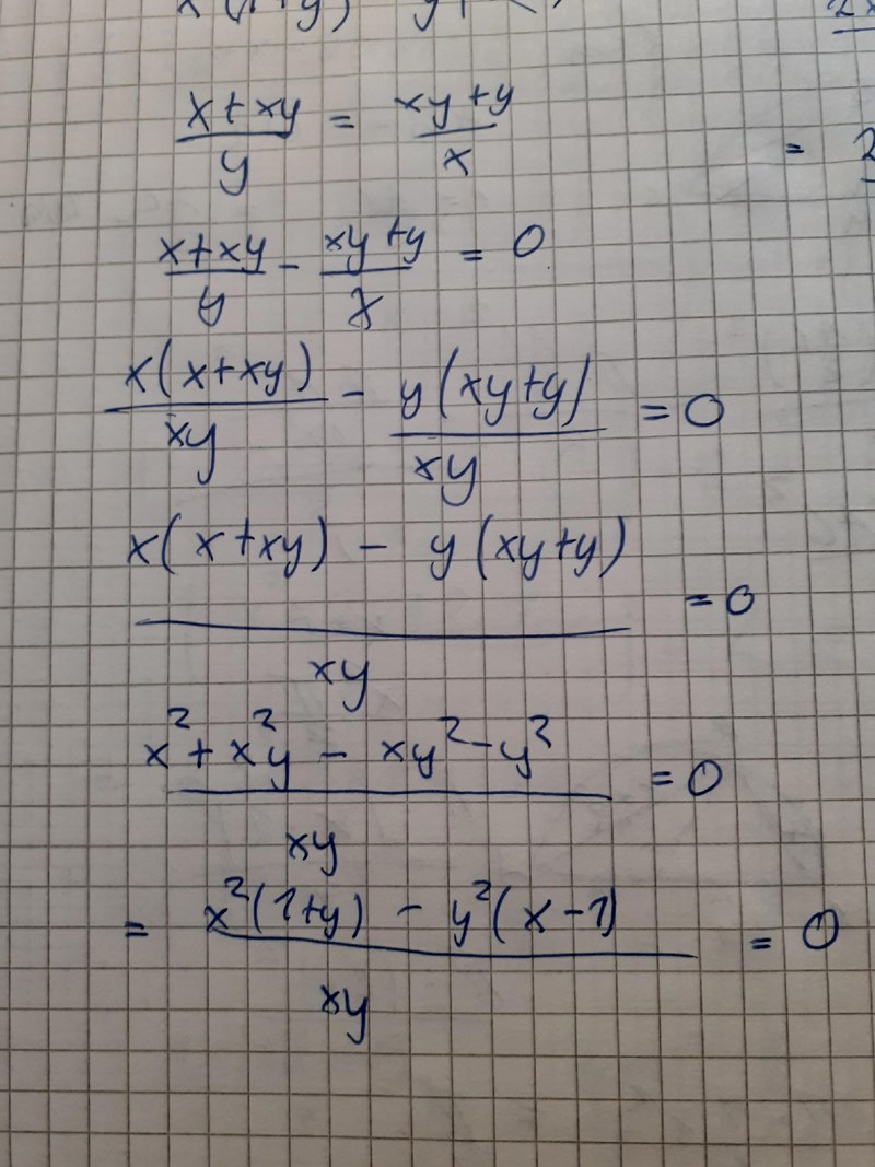 Såna här uppgifter är kluriga, det gäller att hitta rätt start och sen hoppas att det faller ut. Det går säkert att lösa med starten du gjort också, men vad jag menade var att bara samla bråken x/y och y/x på ena sidan, och resten på andra: