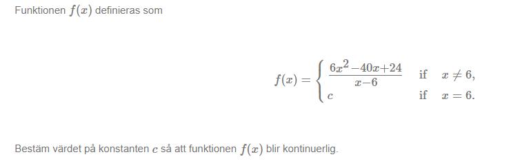 Bestäm värdet på konstanten c så att funktionen f(x) blir kontinuerlig (Gränsvärde/Limits)
