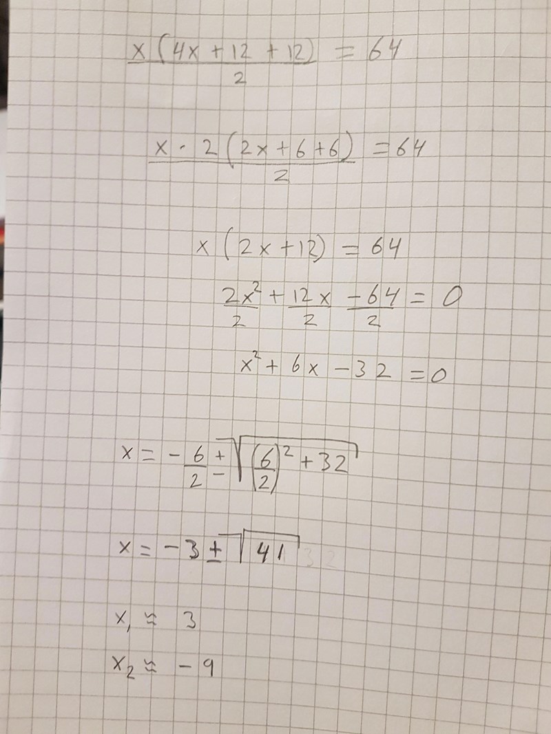 Arean x * (2x + 12) ska bli 64, men 3 * (6 + 12) är 54.