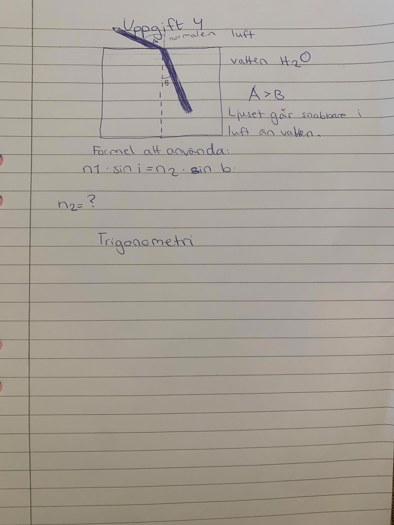 ta fram ett glas, helst rak och fyll på det med vatten. Lägg i en penna som stödjer mot kanten, dvs som står snett. Gör nödvändiga mätningar och bestäm vattnets brytningsindex. Såhär har jag ritat upp men jag förstår inte vilka vinklar jag ska räkna är det endast vinkeln A då n2 är intressant?