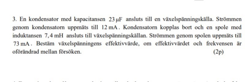 Här är en fråga som jag visste formeln jag skulle använda men fick hjärnsläpp i 2 h och hoppade över den på en tenta. Det enda jag vet är att vi ska använda derivatan av strömmen och U= utopp/roten ur 2