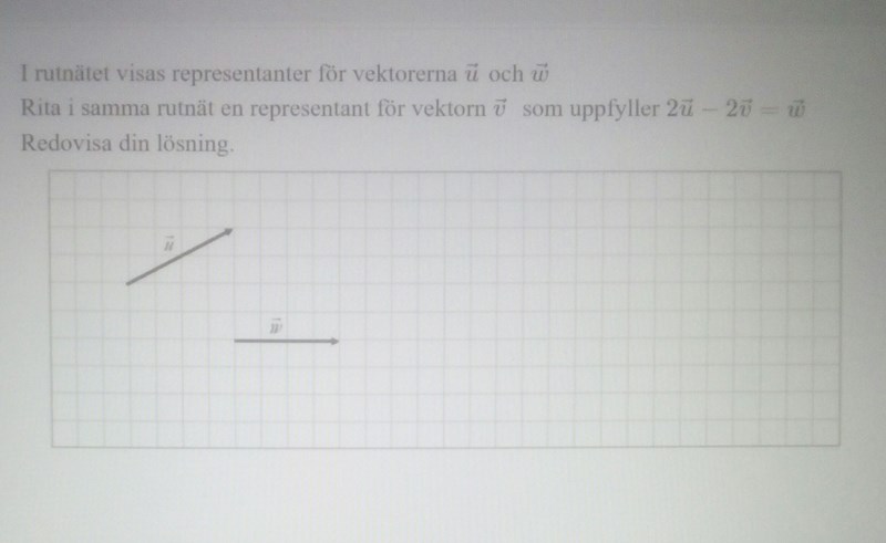 Smaragdalena skrev:Vektorn 2u har samma riktning som u men är dubbelt så lång. Vektorn -2v är dubbelt så lång som vektorn v men pekar åt andra hållet. Börja i en tom "korsning" och rita vektorn 2u. Börja i denna vektors slutpunkt och rita vektorn -2v. Rita en pil från startpunkten till slutpunkten och kalla den w. (Det skall vara pilar över bokstäverna, men jag tror att du fattar ändå.)