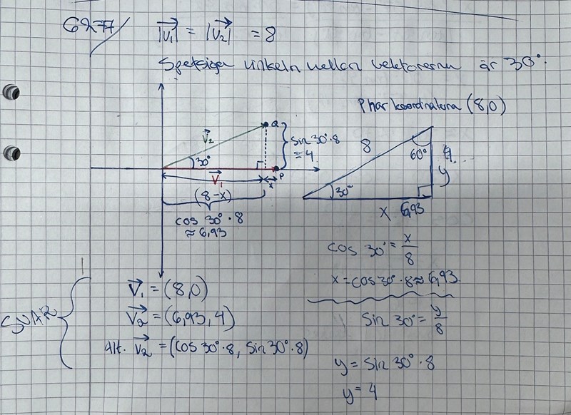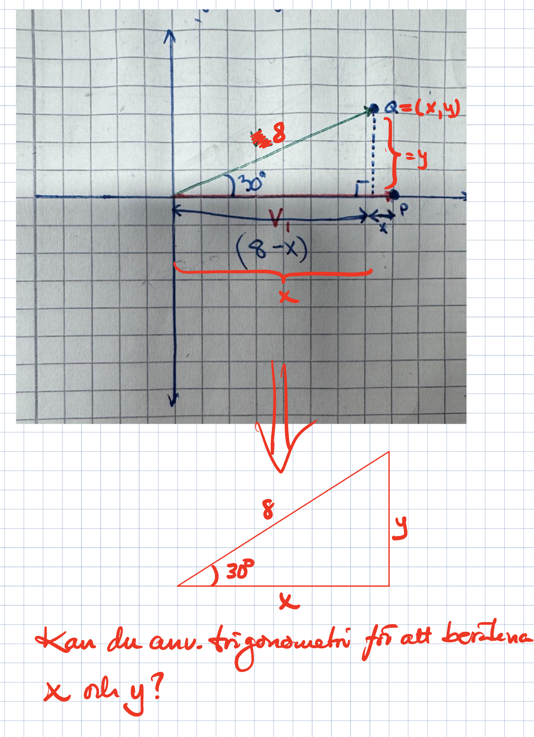 Men om jag gör som du sa så har jag lite svårt att veta hur lång jag ska göra den andra vektorn. Jag vet att den ska vara 8, och i 30° vinkel till den andra vektorn som jag ritat på x-axeln, så vet jag inte i vilken punkt den slutar i. Jag försöker komma på något matematiskt metod för att komma fram till det, men kan inte komma på något.