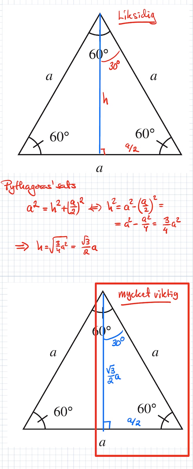 OBS! En triangel med vinkel 30° och 90° ger att den andra vinkeln är ????? Och vad kallar vi en spdan triangel och vad vet vi om dess sidor. Det är en mycket känd triangel.