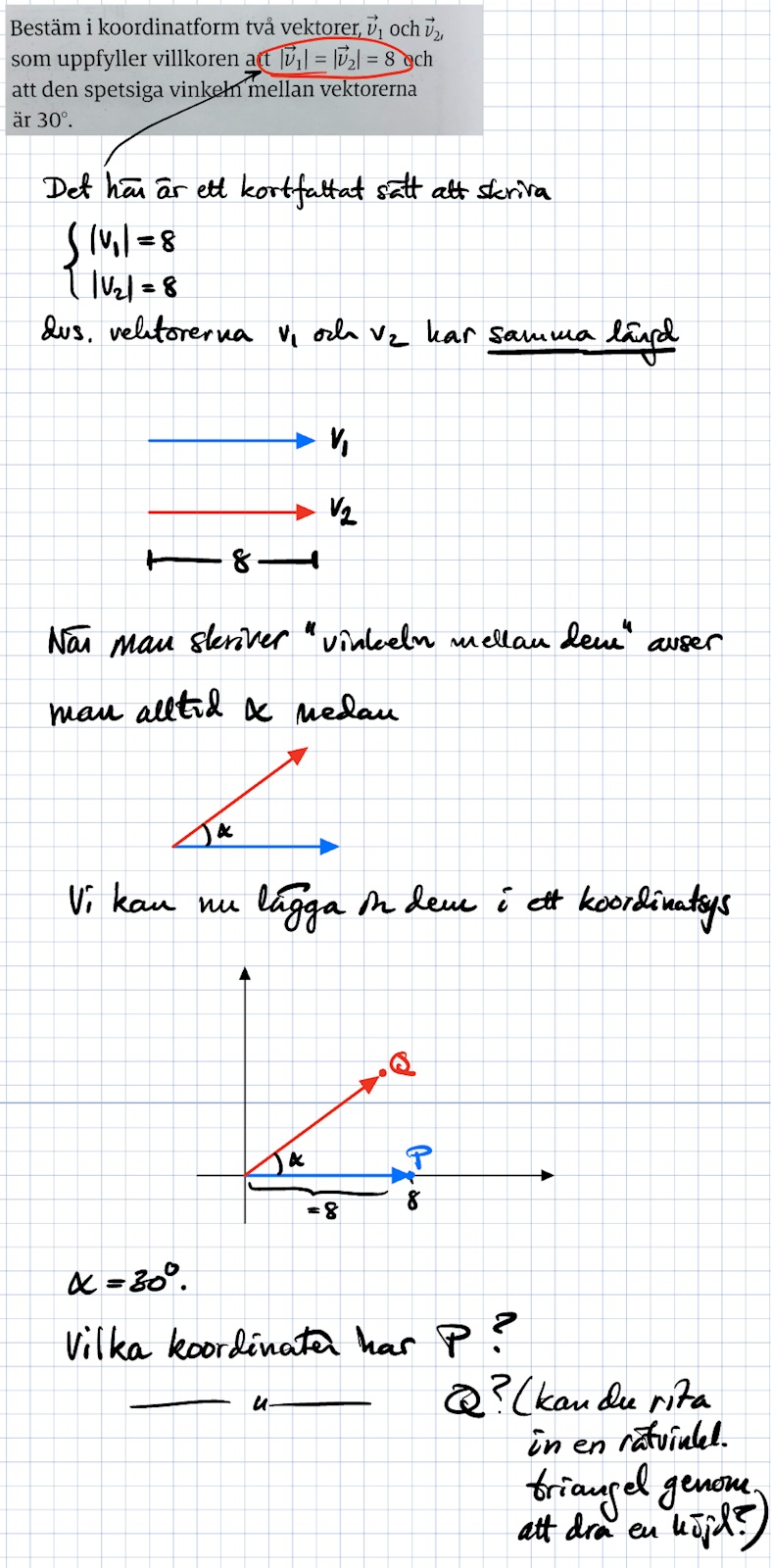 EXAKT! Rita och berätta mera för oss! Vad kan du säga om längden på den röda vektorn? Sätt ut siffran på rätt ställe och ersätt alpha med 30°