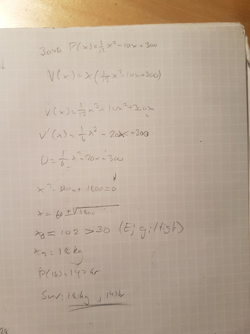 Yngve skrev:TheDovah skrev:Smaragdalena skrev:Det är inte priset du skall maximera, det är inkomsten. Hur stor är inkomsten om fiskaren fångar och säljer x kg kräftor?