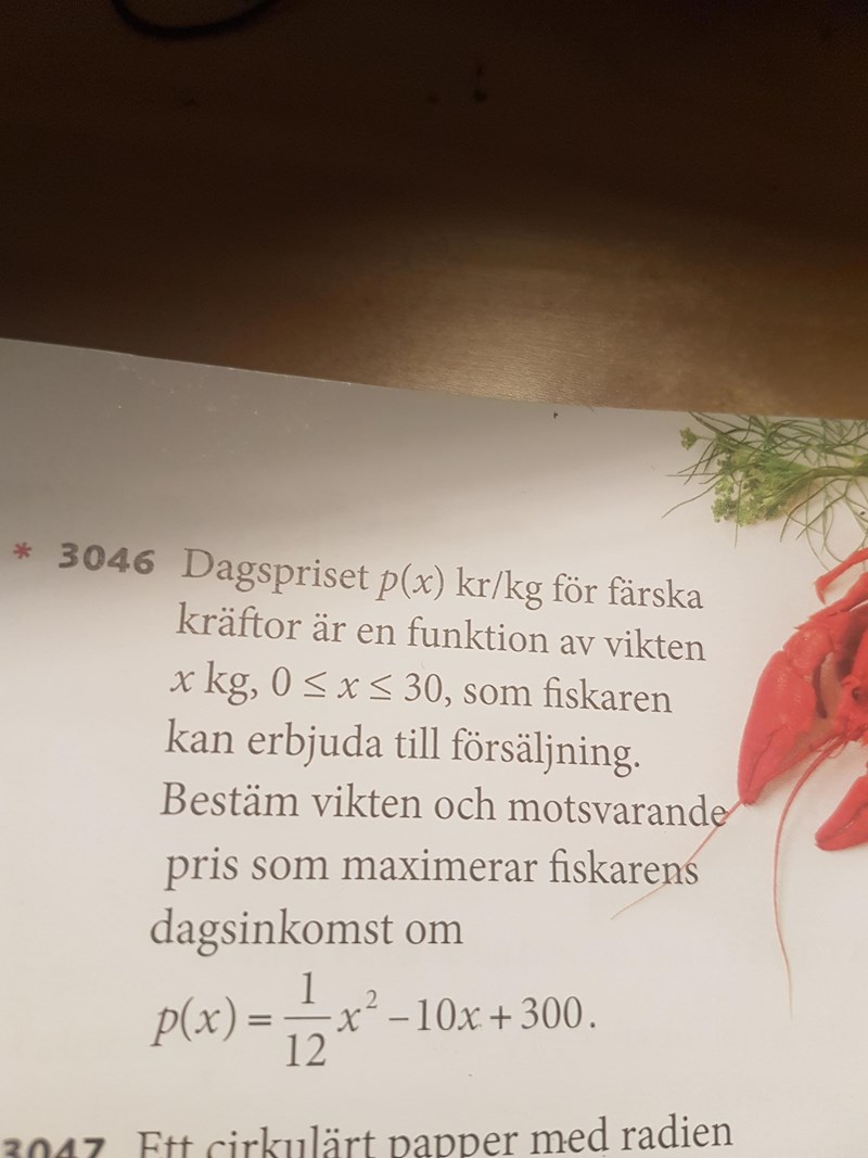 TheDovah skrev:Smaragdalena skrev:Det är inte priset du skall maximera, det är inkomsten. Hur stor är inkomsten om fiskaren fångar och säljer x kg kräftor?