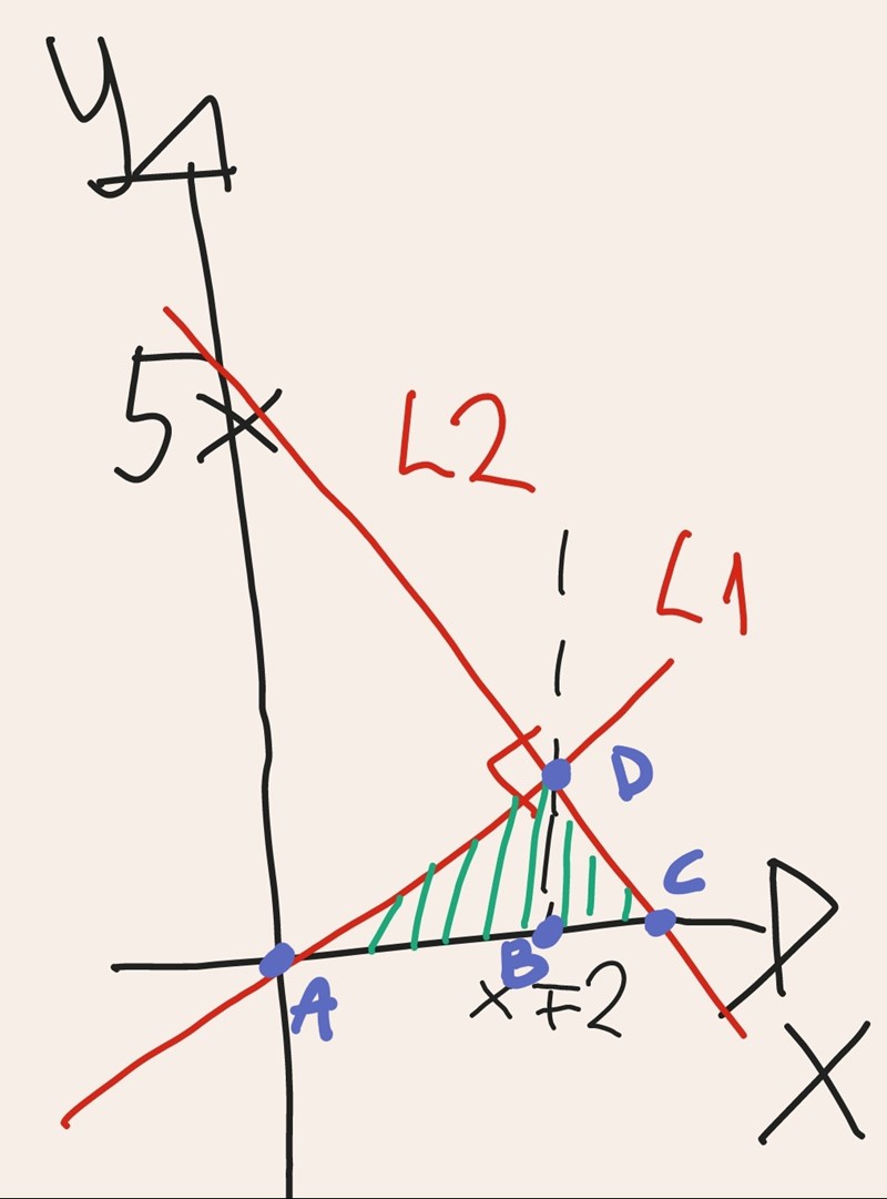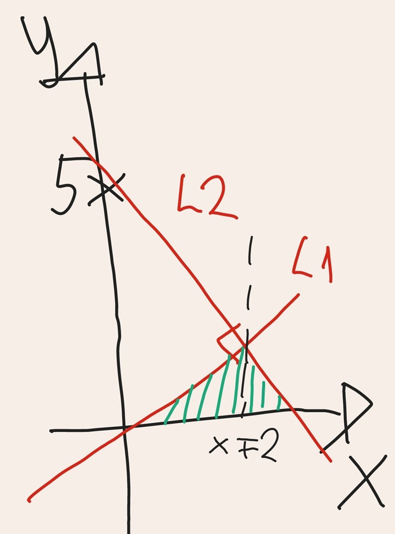 Den lila triangeln begränsas av L1, L2 och y-axeln.