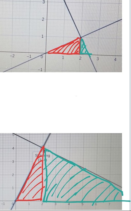 Då räknar du endast med en del av triangeln (de rldmarkerade delarna). Även den delen till höger om linjen x = 2 ska få vara med (de grönmarkerade delarna).