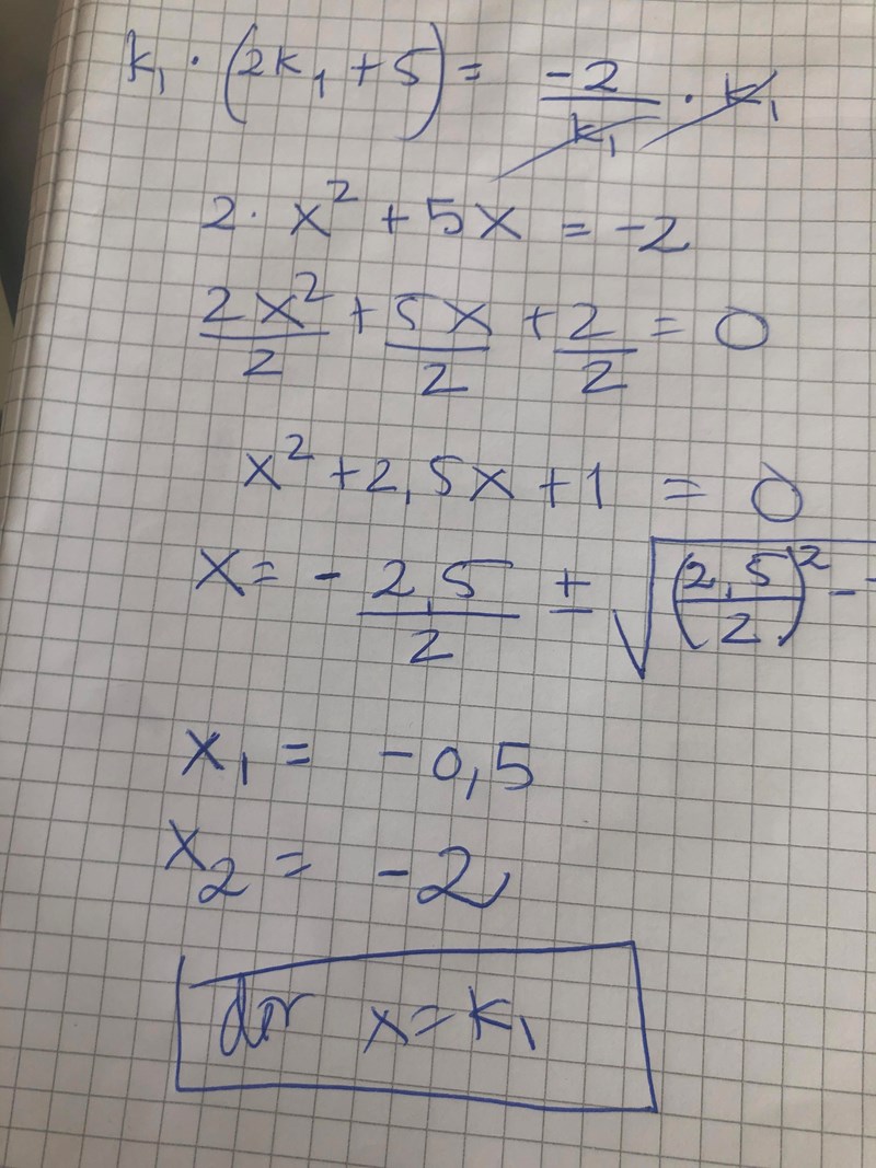 Eftersom linjerna då skär varandra så är dessa yy-värden lika stora, vilket ger ekvationen 2k1+5=-2k12k_1+5=-\frac{2}{k_1}.