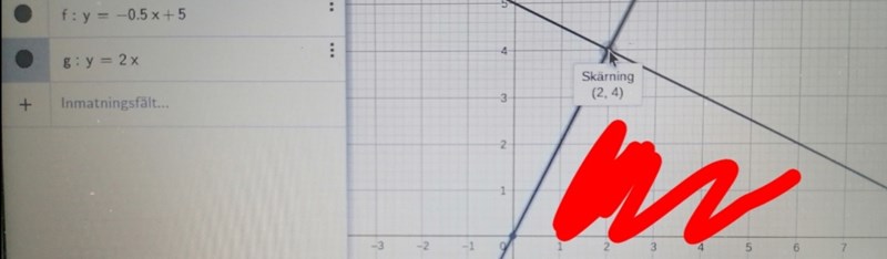 I min bild gick L1 genom origo och L2 genom (0:5) men i mina uträkningar så bytte jag plats på dem och angav istället ekvationen y=k1x+5y=k_1x+5 för L1 och ekvationen y=k2xy=k_2x för L2.