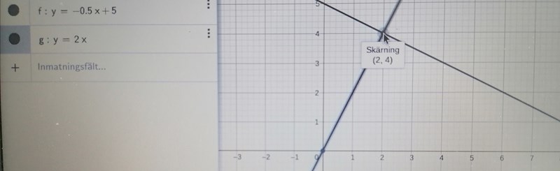 om L2 istället är y= - 0.5x+5 och L1 y= 2x då blir arean 2*4/2=4ae. Är det rätt tänkt?