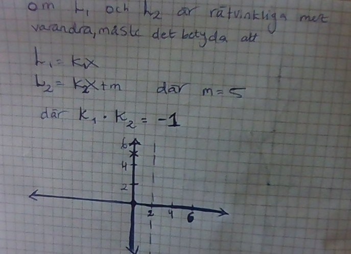 Så långt har jag lyckats komma.  y=2*K1 ger oss höjden av en viss triangel. y=2*k2+5 ger oss en annan höjd där k1 *k2 =-1 , (de skär varandra där x=2). K1 = -1k2. Vad blir nästa steg?