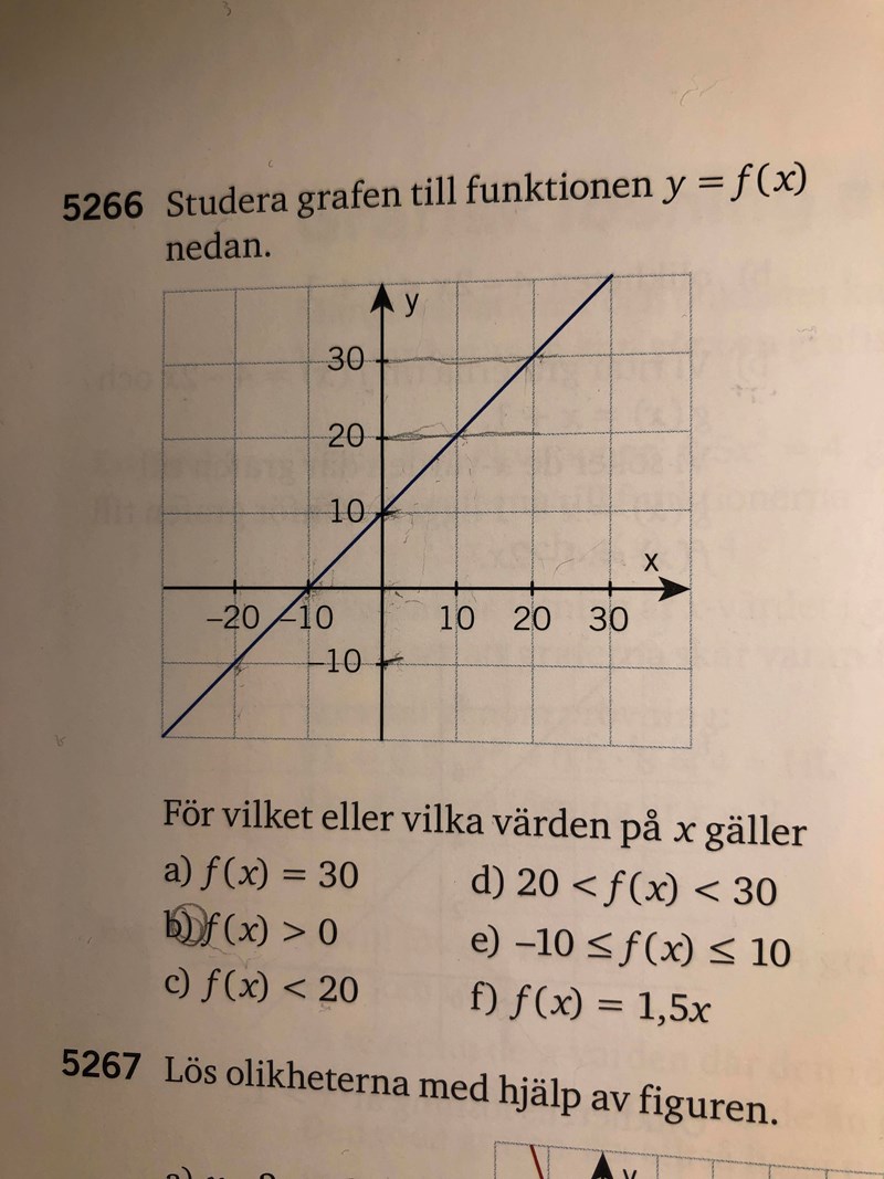 För b)? Kom ihåg att f(x) är värdet på y när vi har ett visst x-värde. När ligger linjen över x-axeln (dvs. funktionens värde är större än noll)?