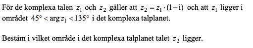 Laguna skrev:Man vet något om argumentet för z1, och du kanske kommer på en formel som säger något om argumenten för produkten av två komplexa tal?