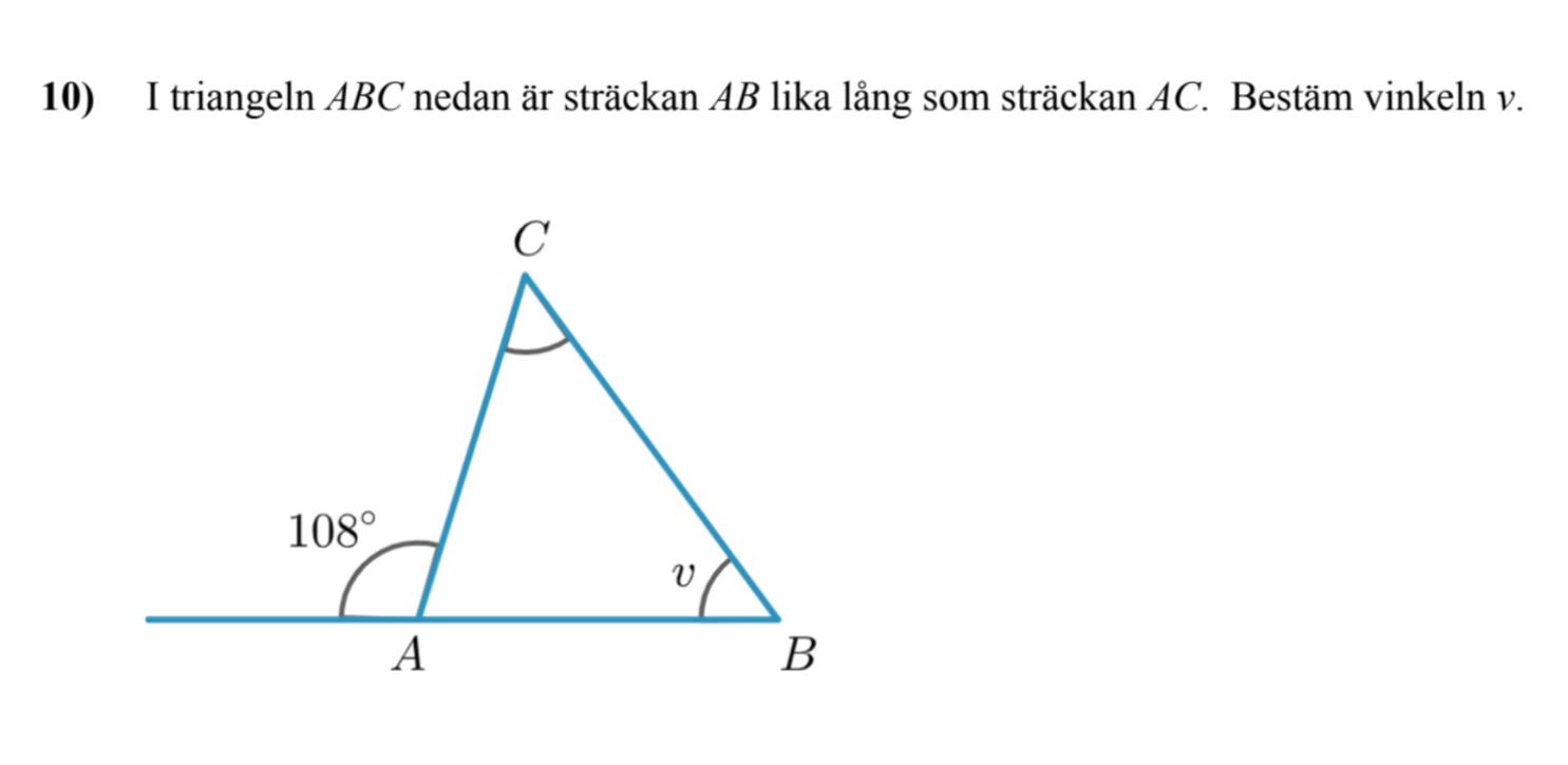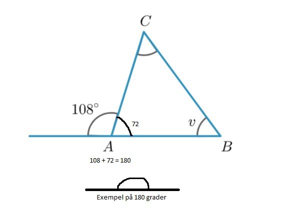 Vi kan med hjälp av yttervinkeln , ta reda på vinkel A. För att yttervinkeln på 108 grader ska vara 180 grader behövs ytterligare 72 grader. Dessa 72 grade utgörs i triangelns vinkel A