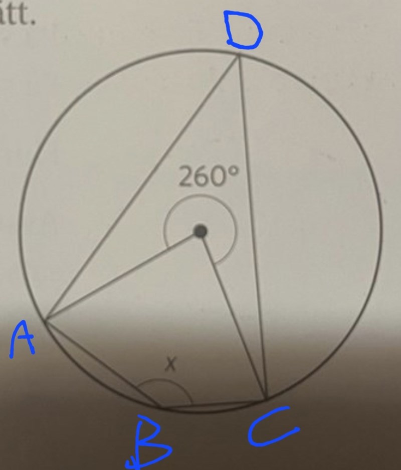 Det andra är att använda att fyrhörningen ABCD är inskriven i en cirkel, dvs att alla fyra hörnen ligger på cirkeln. Då är vinkelsummannav två motstående hörn alltid 180°