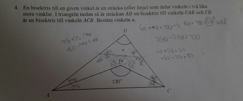 jag är inte säker på att det är rätt men jag fick 80 grader. Jag tror vinklarna som jag har skrivit i trianglarna syns.