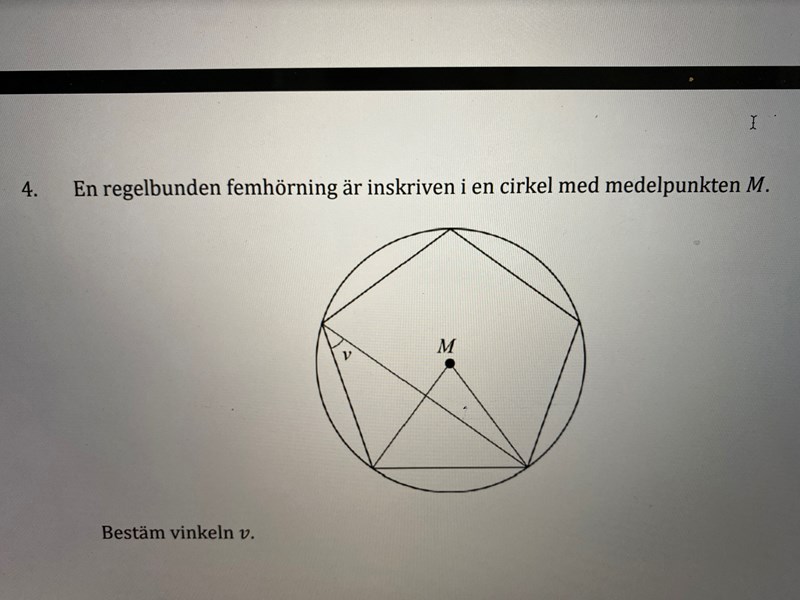 Hej, vet inte riktigt hur man ska göra denna. Tänkte att man kunde dividera hela femhörning i 6 och att därför M punkten blev 60* och vinkel v blev då 30*. Men det är fel någon som vet hur man ska tänka?