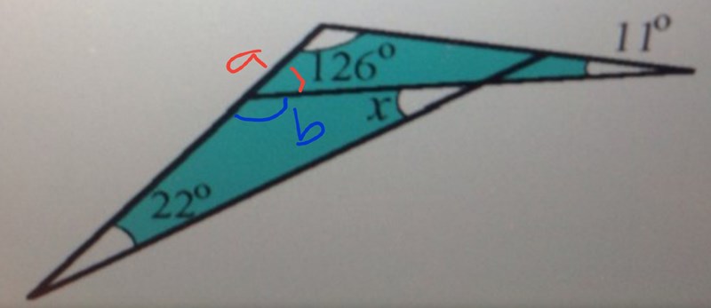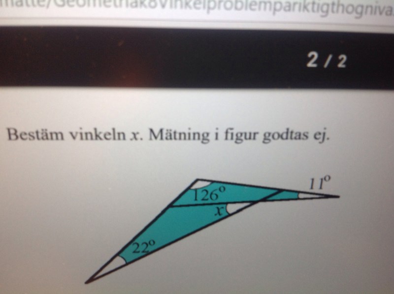 löste ut och fick x till 21 grader genom att ta 180-126-11=43 180-43=137 180-137-22=21 grader?
