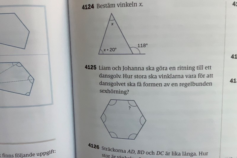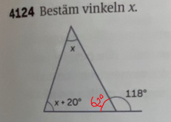 Använd yttervinkelstats. Försök att addera vinkeln x med x + 20 ska vara lika med 118.