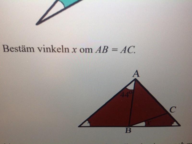 Skulle behöva hjälp med denna. Tacksam om någon kan förklara vart jag ska börja. Jag tänker typ räkna ut vinklarna i den stora triangeln först och sedan den lilla men tycker det är lite svårt. AB skulle kumma vara 44 grader+44 grader men vet inte