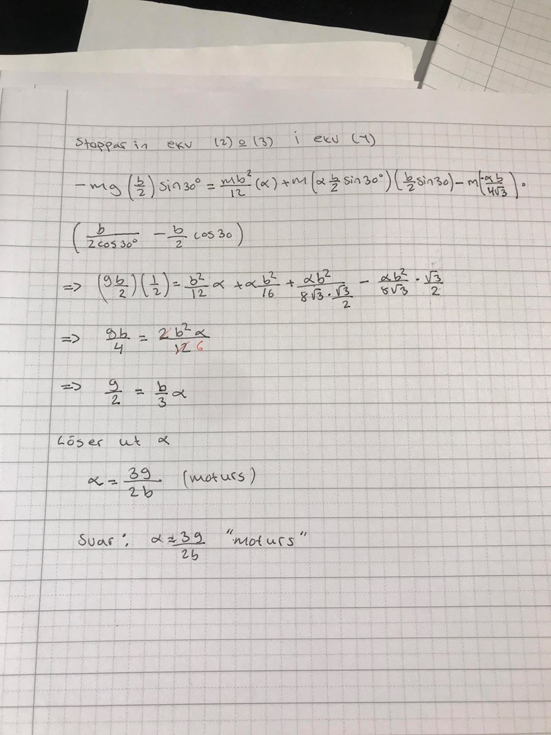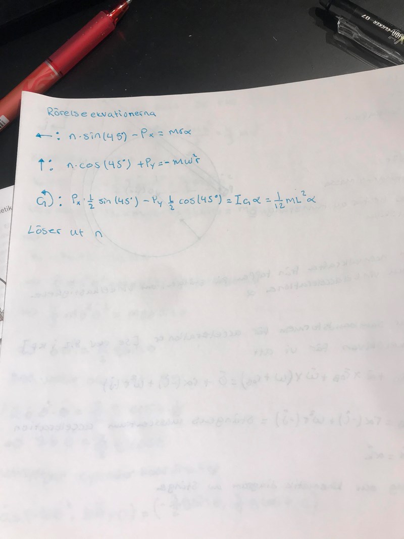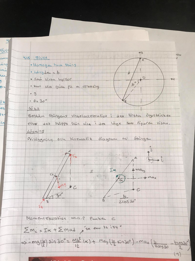 Fick den här kommentar av min lärare oxå ”Du ställer upp felaktig formel. Ställ istället upp momentekvationen m.a.p. G, samt kraftekvationerna på komponentform.”