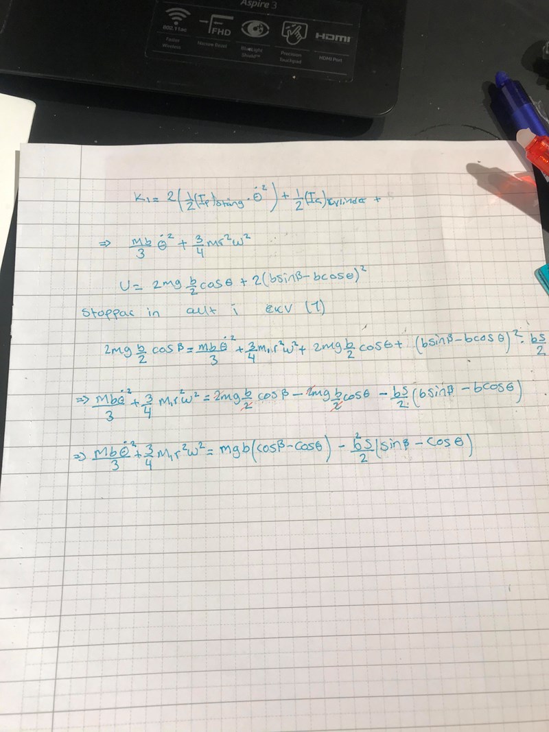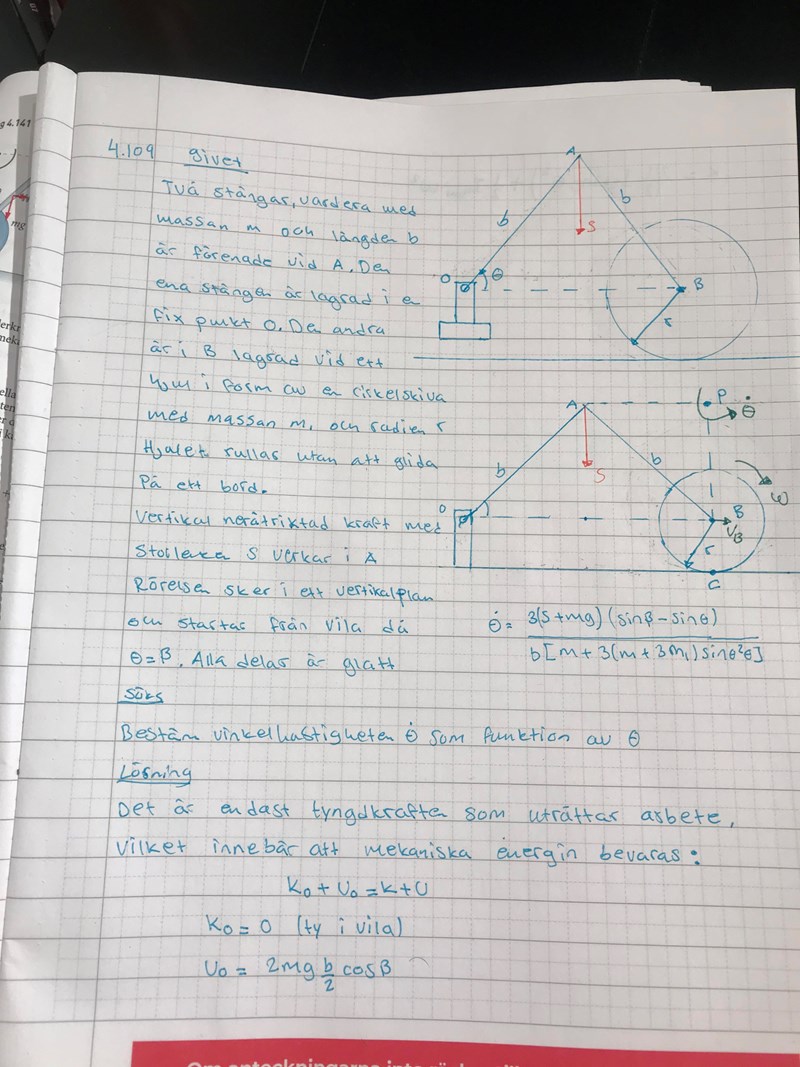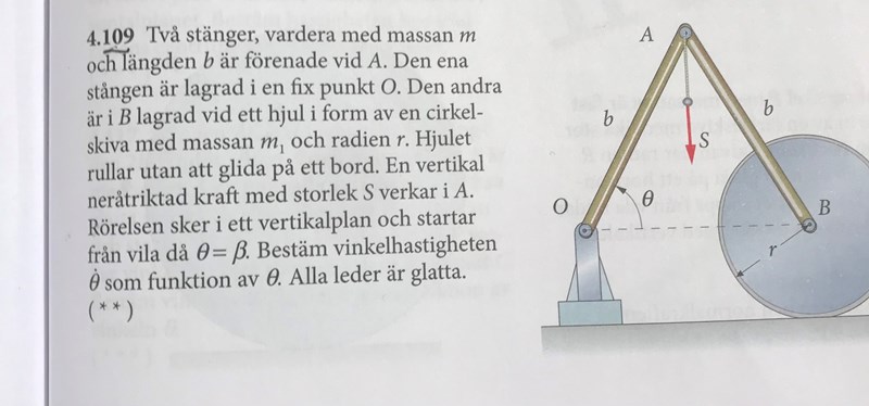 Den kinetiska energin för den första stången är IO. Men hur räknar du ut den kinetiska energin för stång 2? Den potentiella energin borde kunna skrivas U = b(mg+S)sin.