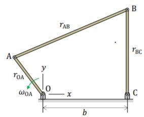 Ett länksystem består av tre länkar: OA, AB och BC. Länkarna har längderna 𝑟OA = 100 mm, 𝑟AB = 260 mm respektive 𝑟BC = 180 mm. Avståndet mellan de fixa punkterna O och C är 𝑏 = 180 mm. I det givna ögonblicket har punkten A