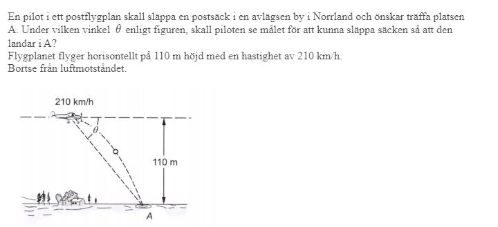 Jag tror att en bra lösningsidé kan vara att först räkna ut hur långt i x-led från punkten A som planet ska befinna sig när man släpper säcken, för att därefter bestämma vinkeln.