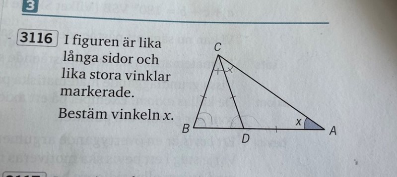 Vet bara att eftersom ADC triangeln ör likbent så är C vinkeln i den triangeln lika stor som x.