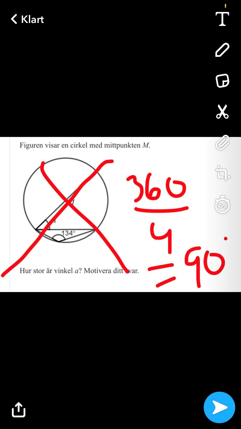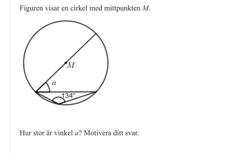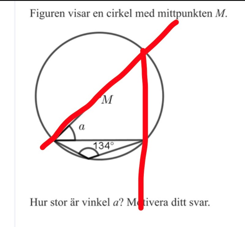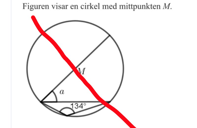 Då borde punkten M bli medelpunkten och vinkeln 134 randvinkeln.. Eller?