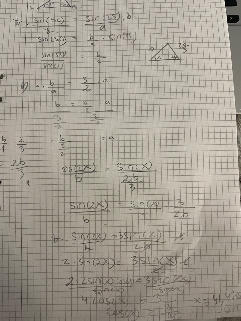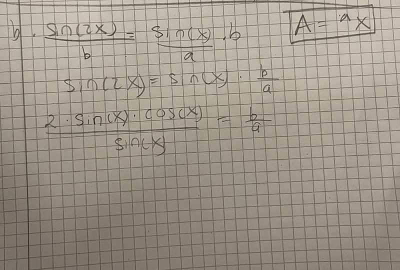 Förutsätter att du har kallat vinkeln A för x. Eftersom x då är en vinkel i en triangel så kan x inte vara 0 och inte heller 180. Då är sin x skilt från 0. Det sista uttrycket du skrev kan då förkortas med sin x, varför uttrycket blir: b/a=2cos x = 2cos A. Detta torde vara det sökta sambandet. b och a är sidor i en triangel och därför är a>0 och b>0. De värden som b/a kan anta ligger därför i intervallet 0<b/a<2.
