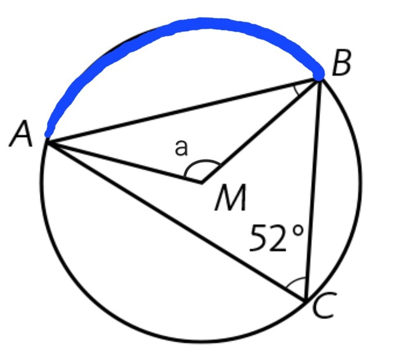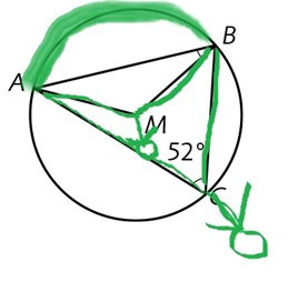 Kan man säga/skriva att vinkeln ACB med sina 52 grader är randvinkeln till M ?