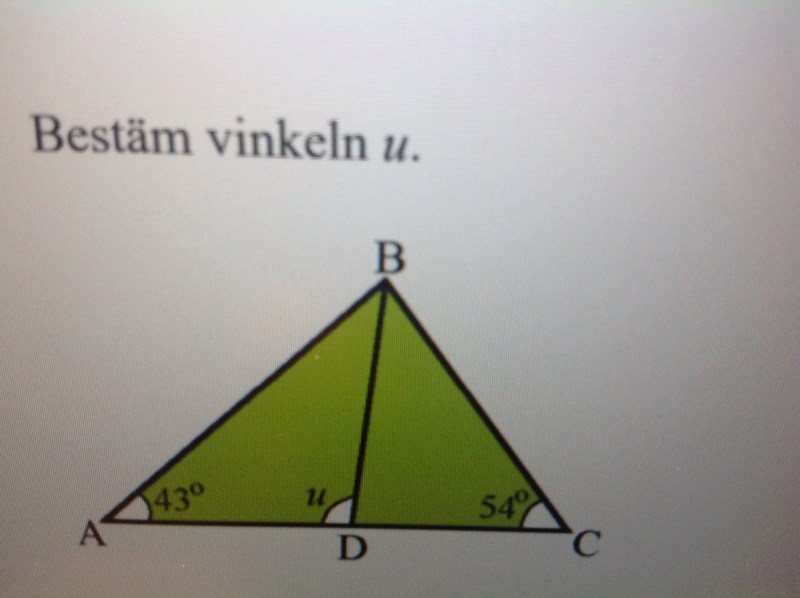 (Vinkel B är 180° - 54° - 43° = 83°, men det hjälper inte om vi inte vet var på sträckan AC som punkten D ligger)