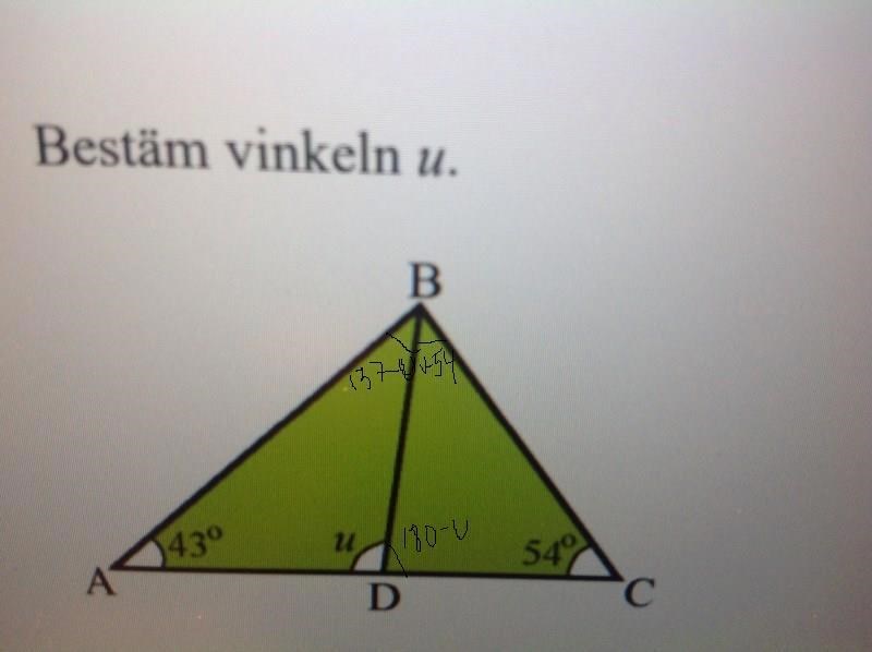 . Vinkeln B blir ju 180-54-43= 83 grader