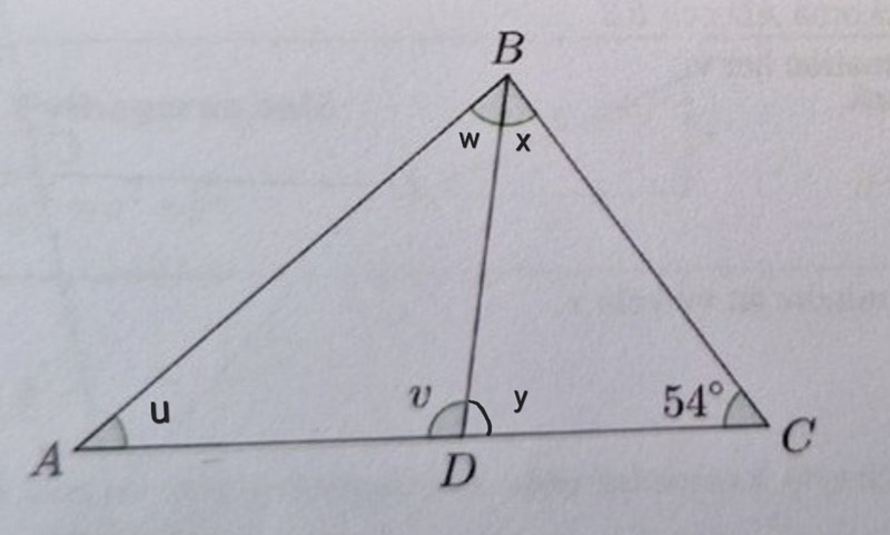 Att sedan AD är lika lång som BD innebär att ABD är en likbent triangel. För en sådan gäller att basvinklarna är lika stora. I ditt fall innebär det att u = w.