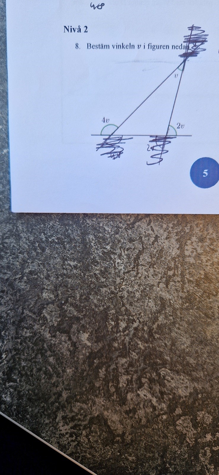 Hej! Du kan nyttja att summan av två vinklar längs en rät linje är 180 grader. Då får du att vinkeln bredvid 4v i triangeln är 180-4v och på liknande sätt att vinkeln bredvid 2v i triangeln bli 180-2v. Då har du vinklarna v, 180-4v och 180-2v i triangeln. Då kan man nyttja att vinkelsumman i en triangel är 180 grader och man får då v+180-4v+180-2v=180. Efter lite förenkling får man v=36.