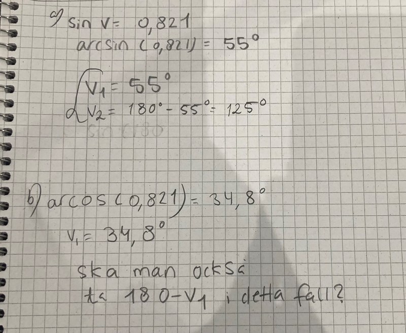 Har jag gjort rätt i a? Jag fick att det kan finnas två vinklar. Se lösningen ovan. I b har jag däremot några funderingar. Hur ska man göra, ska man också ta 180-v för att hitta den andra vinkeln? Jag har hört talas om att man ibland ska utesluta andra vinkeln v2. När ska göra det och när ska man inte göra det?