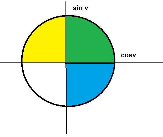 I den gula är sin v positiv. I den blå delen är cos v positiv. I gröna delen är båda positiva.