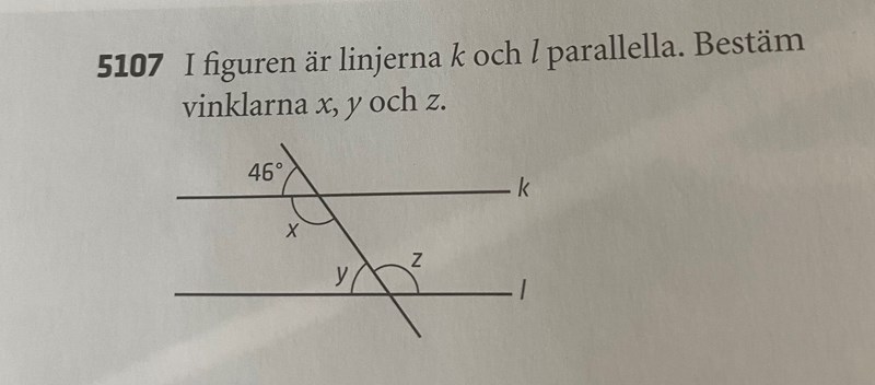 förklaring: eftersom vi redan har en vinkel som är 46 och enligt vertikalvinkel som säger att två motsvarande vinklar är lka stora då bildar vi oss att motsvarande vinkel är 46 och eftersom vi vet ett en halv varv är 180 grader då gör vi så :