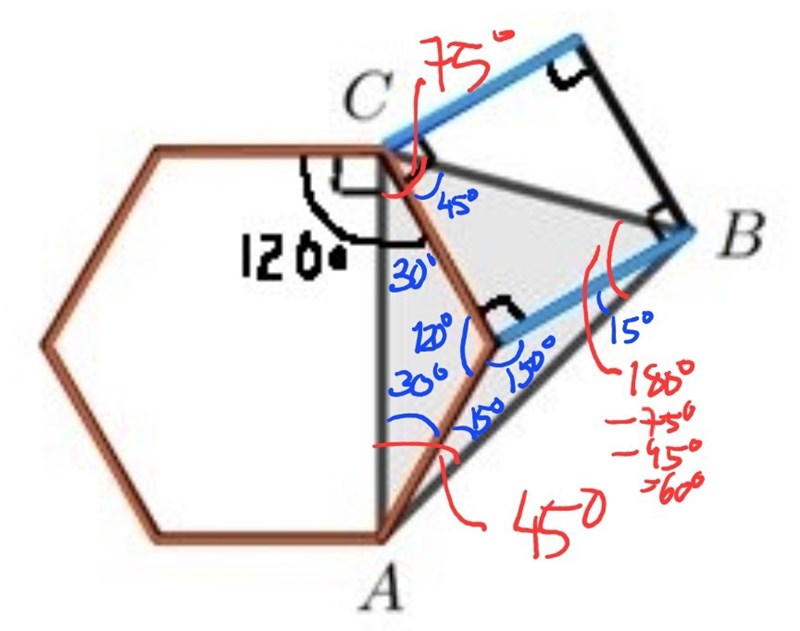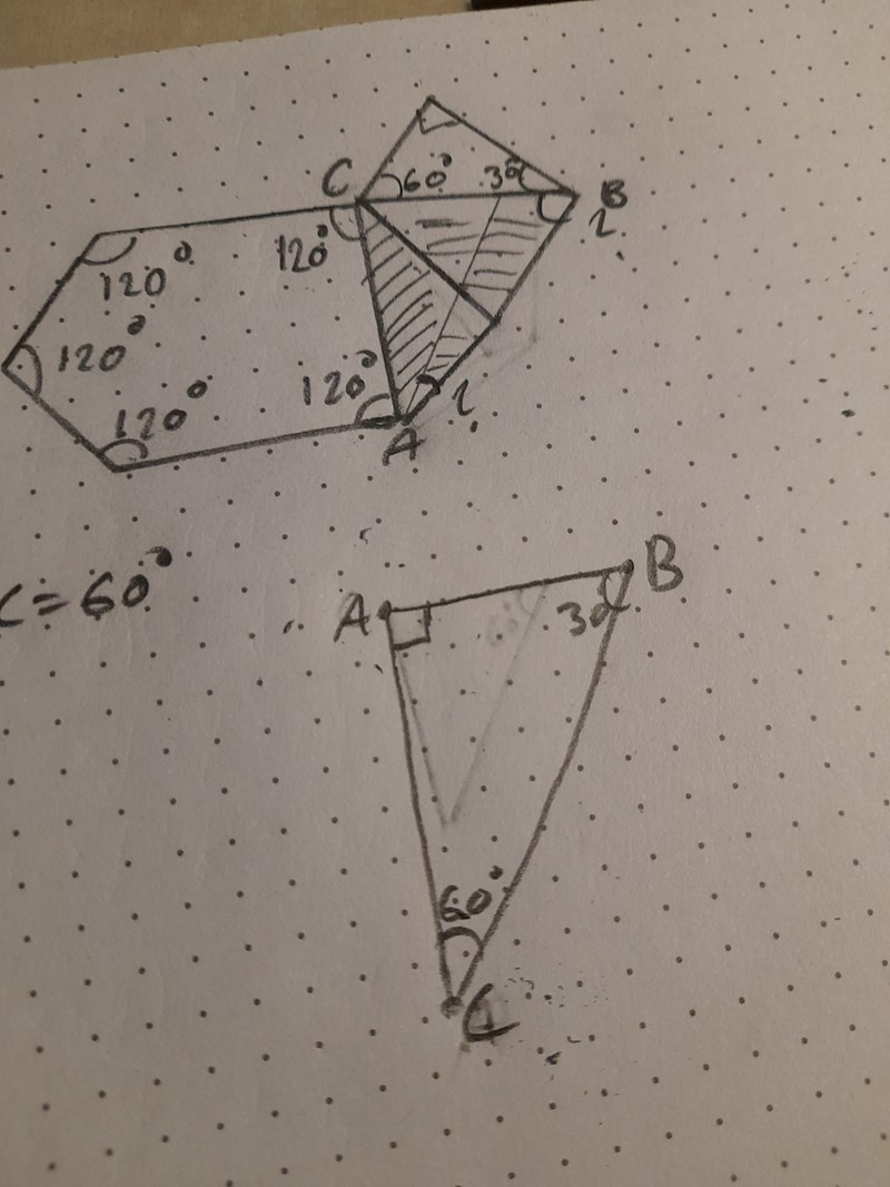 Vinkelsumman i en sexhörning är inte samma som i en triangel. Du borde oxå se att alla vinklar är trubbiga.