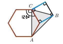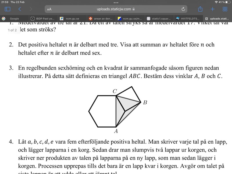 Att det är en regelbunden sexhörning och en kvadrat ger dig mycket ledtrådar kring de små trianglarnas vinklar. Kan du se hur? Tips: Tänk likbenthet.