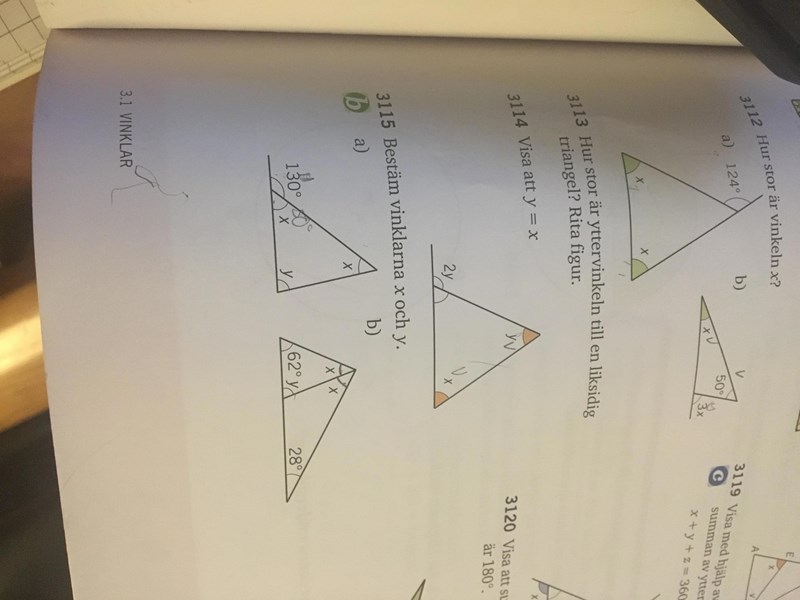 Vinklarna 28°+62°+2x bildar den stora triangel. Du kan då få ut vad 2x är. Eftersom det är 2x kan du bara dela det på 2 för att få fram x. Då har du endast y kvar. 180-62-x