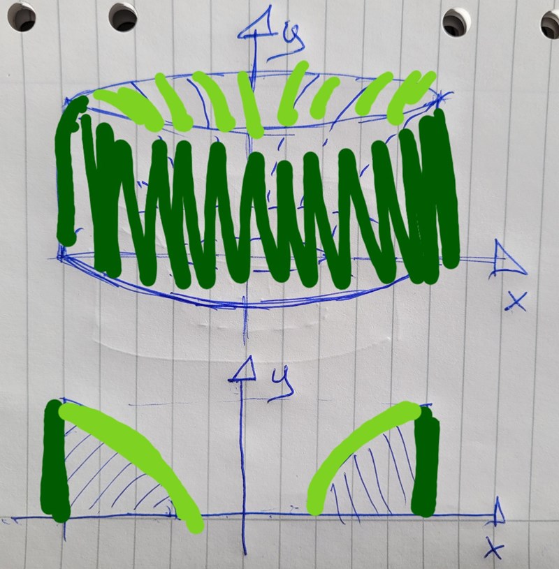 Den ljus gröna delen bildar alltså insidan av cylindern dvs det timma rummet medans den mörka gröna delen bildar cylindern som har ett hål i mitten