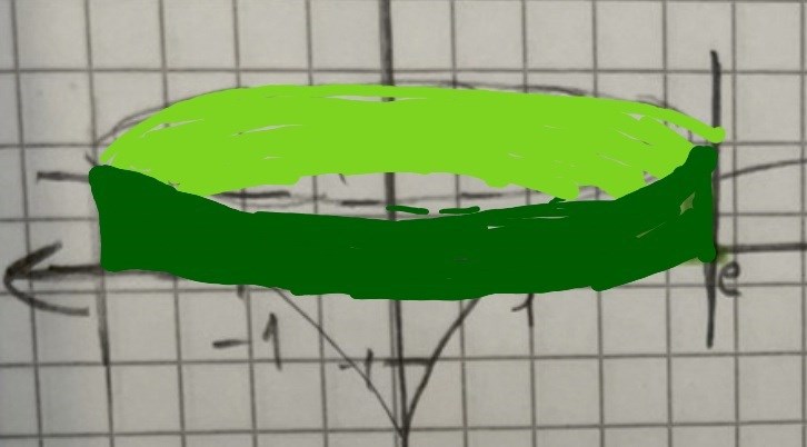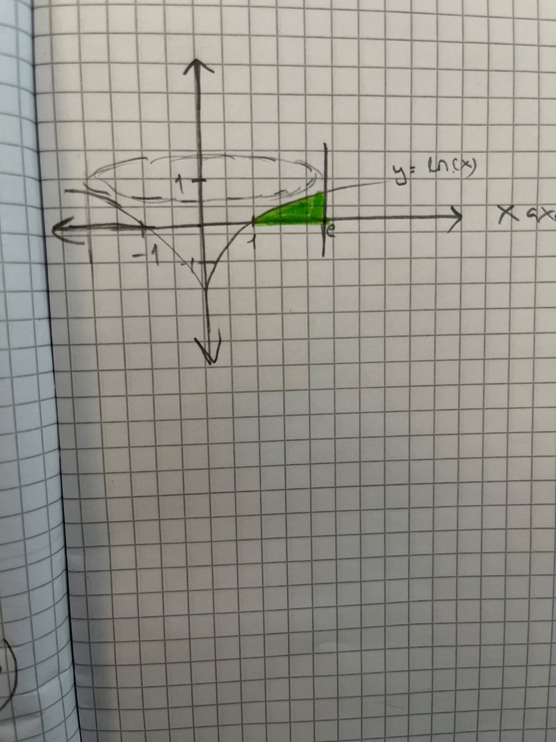 Diametern på ”skivorna” sträcker sig från x=-1 till 1 alltså är det 2 . Radien blir 1 , ska jag alltså integrera f(x)=ln(x) mellan x=-e till x=e. Eller är radien lika med e? Nu blir jag förvirrad