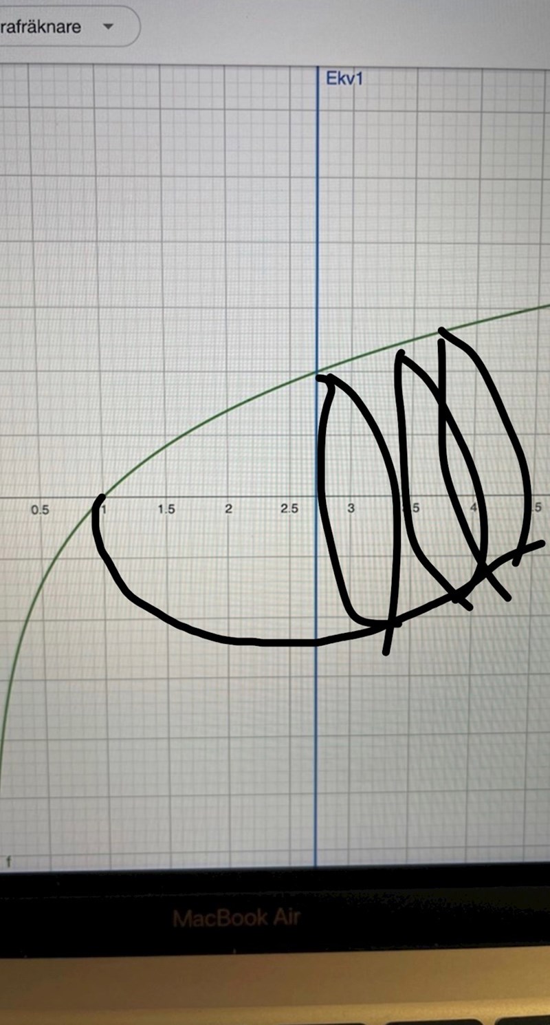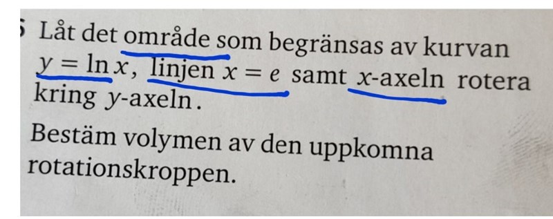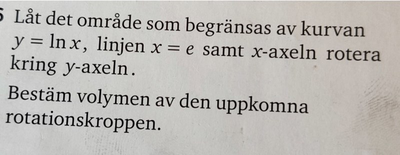 Yngve skrev:Katarina149 skrev:Okej. Jag förstår ditt exempel och hänger med på tankesättet. Men varför ger rotationsvolymenav funktionen y=ln(x) volymen V2?