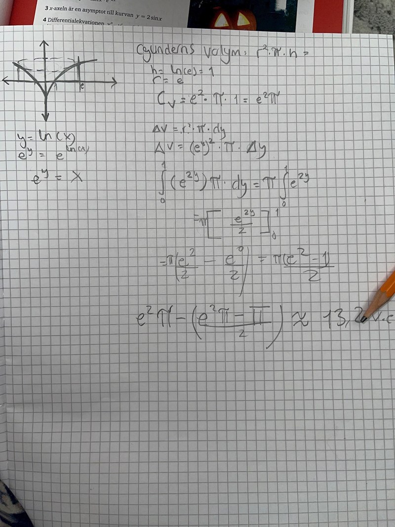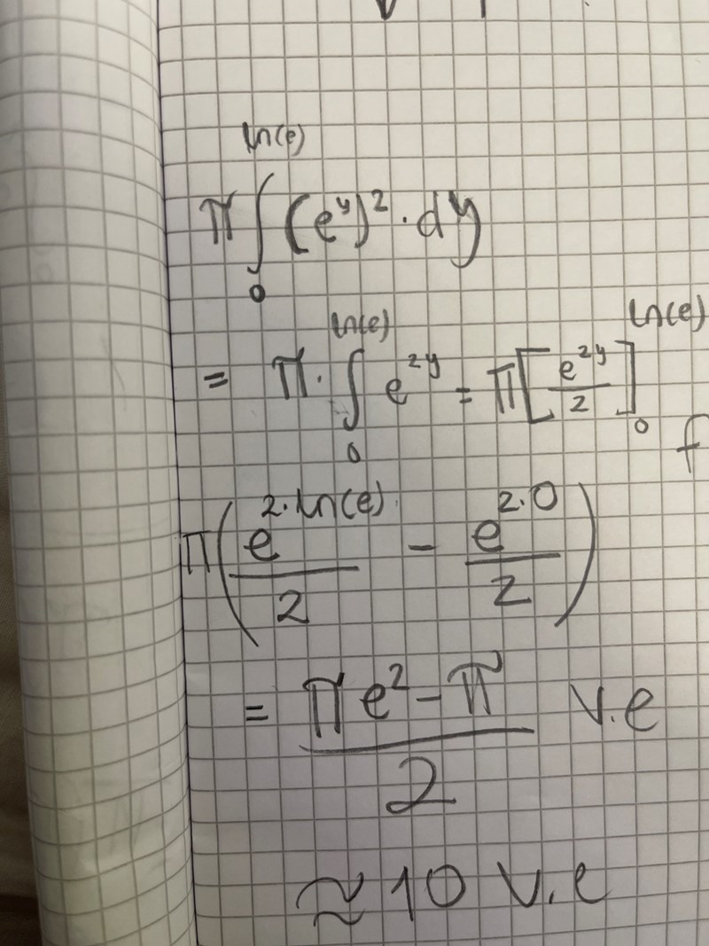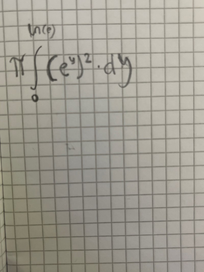 då ska man väl ta pi * Integralen av (ln(x))2 mellan y=0 till y=ln(e)