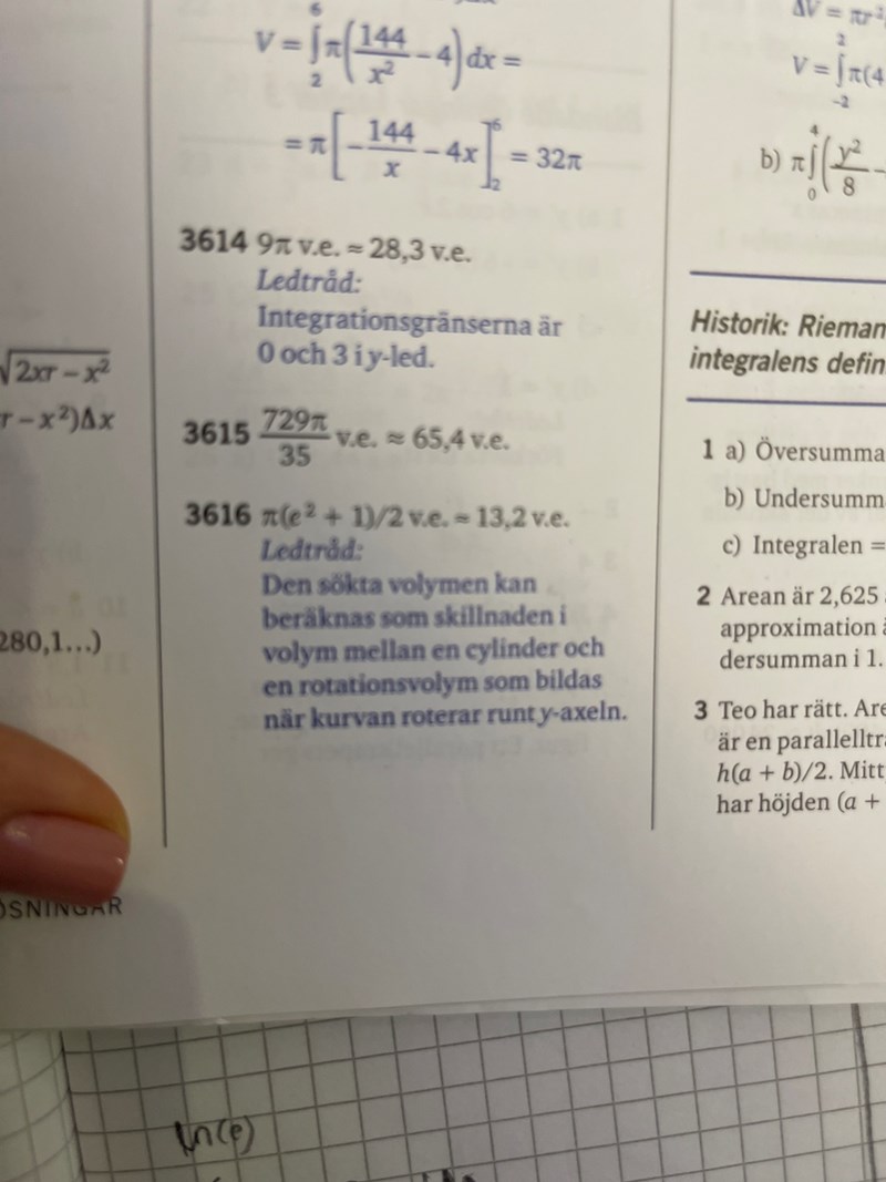 Katarina149 skrev:Okej. Jag förstår ditt exempel och hänger med på tankesättet. Men varför ger rotationsvolymenav funktionen y=ln(x) volymen V2?